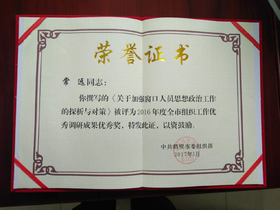 4月5日上午,鹤壁市机关党的工作会议在市人民会堂三楼视频会议室召开。会上,市直工委对2016年度先进党组织、优秀共产党员和优秀党务工作者进行了表彰。市行政服务与公共资源交易管理办公室机关党委被评为2016年先进党组织,市工商局窗口李振海同志被评为2016年度优秀共产党员,市医保处窗口常远同志的《如何加强窗口工作人员思想政治工作的探析与对策》分别获得2016年度河南省机关党建课题研究论文优秀奖和2016年度全市组织工作优秀调研成果优秀奖。 2016年市行政服务与公共资源交易管理办公室机关党委在市直工委的正确领导下,狠抓基层党组织建设,具体工作如下:(一)开展党员组织关系摸排工作。按照市直工委要求,对公管办机关党委现有党员从失联党员、口袋党员、违纪党员等方面进行了摸底排查,不存在失联党员、口袋党员、违纪党员现象;同时对98名党员基本信息建立了数据库,便于党员管理。(二)开展基层党组织换届工作。自9月28日至10月12日,将下属9个党支部整合为6个党支部,并按照组织程序进行了支部换届选举。在此基础上,于10月13日召开了机关党委党员代表大会,进行了换届选举,选举中党员代表到会率高达100%,成功率达100%。新一届机关党委委员7名,平均年龄44岁;女性委员1名;40周岁以下委员3名,占42.8%;大专以上文化程度7名,达100%。(三)组织开展党费补缴工作。一是按照市直工委要求,市公管办印发了《在“两学一做”学习教育中开展党费收缴工作专项检查及规范党费管理工作的通知》,要求各支部对本支部党员的基本情况及自2008年4月以来具体交纳党费情况进行摸排分析,对党费欠交或少交的党员,教育引导其按规定进行补交。二是针对党员流动性大、支部委员调整频繁的情况,让党员填写了“党费自查承诺书”,确保党费补缴工作顺利开展。此次党费自查和补缴工作,机关党委有62同志补缴党费24235.09元。(四)做好党员档案自查工作。按照市委组织部工作要求,公管办针对窗口党员档案在原单位的实际情况,研究决定组成两个档案审核小组,分别对机关1支部和2支部的24名党员,对照党员档案存档范围,进行了逐一摸底和核实。并对档案材料不完善的,本着“能找则找、能补则补”的原则,认真按照程序,要求党员尽快补齐缺失手续,确保党员档案资料真实齐全。(五)加强制度建设。机关党委先后引发了《关于调整党建工作联系点的通知》等7份文件,加强了机关党委制度建设;要求各支部认真落实好三会一课等制度。同时还组织开展了“迎七一”诗朗诵等文体活动。