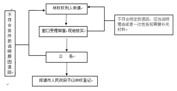 一、设立依据: 1、《中华人民共和国森林法》第三条:国家所有的和集体所有的森林、林木和林地,个人所有的林木和使用的林地,由县级以上地方人民政府登记造册,发放证书,确认所有权或者使用权。 2、《中华人民共和国森林法实施条例》第三条第一款:国家依法实行森林、林木和林地登记发证制度。 第四条:依法使用的国家所有的森林、林木和林地,按照下列规定登记:(三)使用国家所有的其他森林、林木和林地的单位和个人,应当向县级以上地方人民政府林业主管部门提出登记申请,由县级以上地方人民政府登记造册,核发证书,确认森林、林木和林地使用权以及由使用者所有的林木所有权。 第六条:改变森林、林木和林地所有权、使用权的,应当依法办理变更登记手续。 二、申请条件: 浚县农场、鹤壁鑫鹏工贸开发总公司东岭林场提出林权证登记申请的 。 三、窗口职责: 负责本审批事项的政策咨询;负责行政相对人的资格及其报送资料的受理、审查;负责将合格的材料委托有关科室审批(不合格的说明原因,做退件处理);负责将审批文件在窗口及时发放;做好资料归档工作。 四、工作程序(工作流程图可根据本单位具体项目实际情况制定完善) 五、需提供的申报材料: (一)提出初始登记申请的,应当提交以下文件: 1、林权登记申请表; 2、个人身份证明、法人或者其他组织的资格证明、法定代表人或者负责人的身份证明、法定代理人或者委托代理人的身份证明和载明委托事项和委托权限的委托书; 3、申请登记的森林、林木和林地权属证明文件; (二)申请办理变更登记或者注销登记时,应当提交下列文件: 1、林权登记申请表; 2、林权证; 3、林权依法变更或者灭失的有关证明文件 六、法定时限及依据 : 90个 工作日 依据:《林木和林地权属登记管理办法》第十一条:对经审查符合下列全部条件的登记申请,登记机关应当自受理申请之日起3个月内予以登记:(一)申请登记的森林、林木和林地位置、四至界限、林种、面积或者株数等数据准确;(二)林权证明材料合法有效;(三)无权属争议;(四)附图中标明的界桩、明显地物标志与实地相符合。 原承诺时限: 90个 工作日 现承诺时限:经公告无异议的,2日内报请市人民政府予以林权登记。 七、收费标准及依据 :不收费 八、受理地点及联系电话:市行政服务中心林业局窗口 联系电话:0392-3337631 投诉电话:0392-3386199 九、表格下载 |