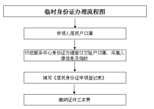 一、项目名称:临时居民身份证 二、法律依据: 1.《中华人民共和国居民身份证法》第十二条; 2.《中华人民共和国临时居民身份证管理办法》第二条。 3.《国家发展改革委、财政部关于居民身份证收费标准及有关问题的通知》 三、申请条件 公民在申请领取、换证、补领居民身份证期间,因急事急需使用居民身份证的,以申请领取临时居民身份证。 四、申报材料 1. 户口薄: 2. 采集人像信息及指纹: 3. 办理第二代居民身份证: 4. 办理临时居民身份证。 五、办理流程: 六、收费标准:居民办理临时居民身份证收费标准为每证10元。 七、 办理时限:自受理申请之日起3个工作日内; 八、受理地点:市行政服务中心九州路派出所 九、监督电话:3392755 |